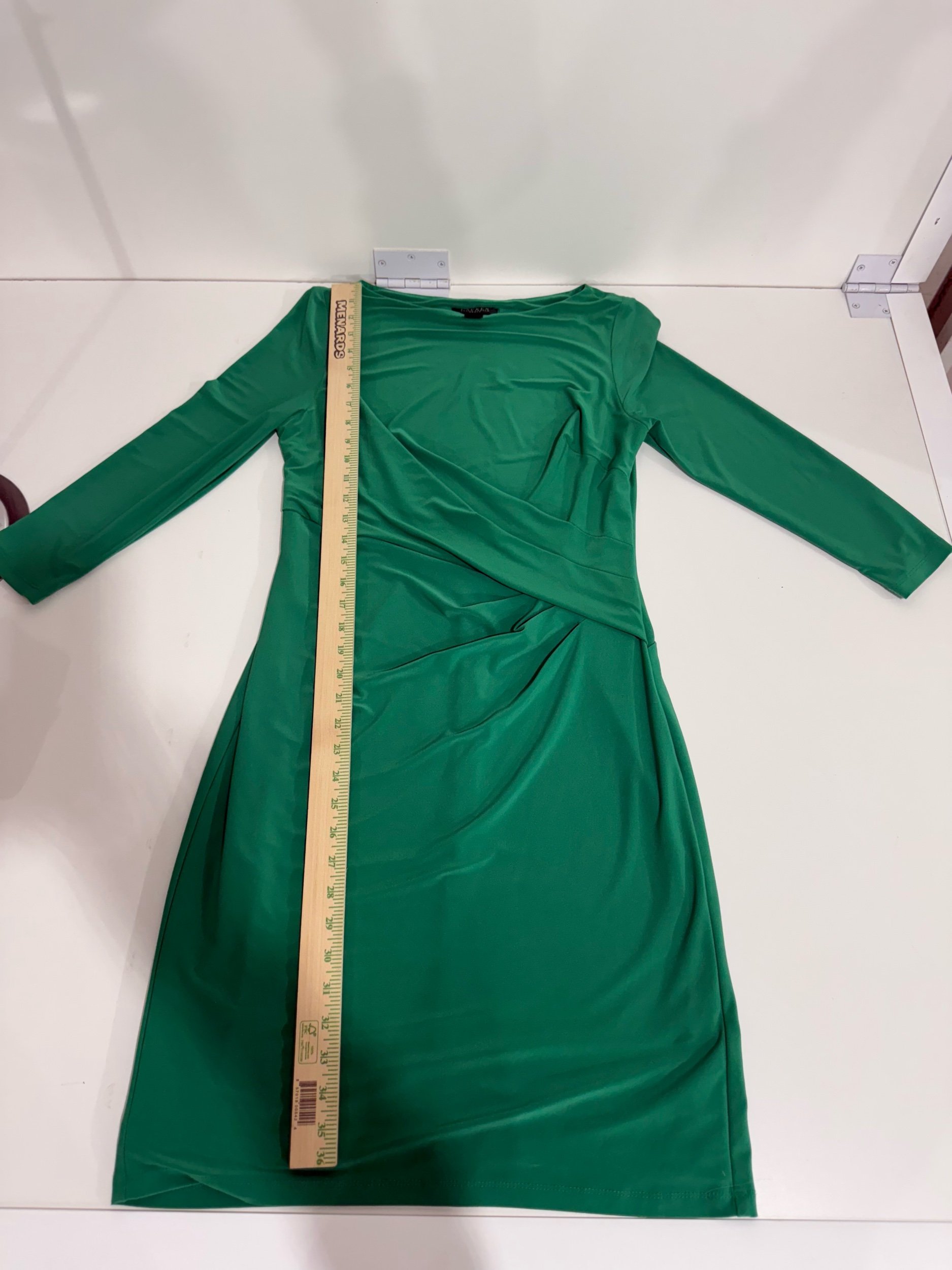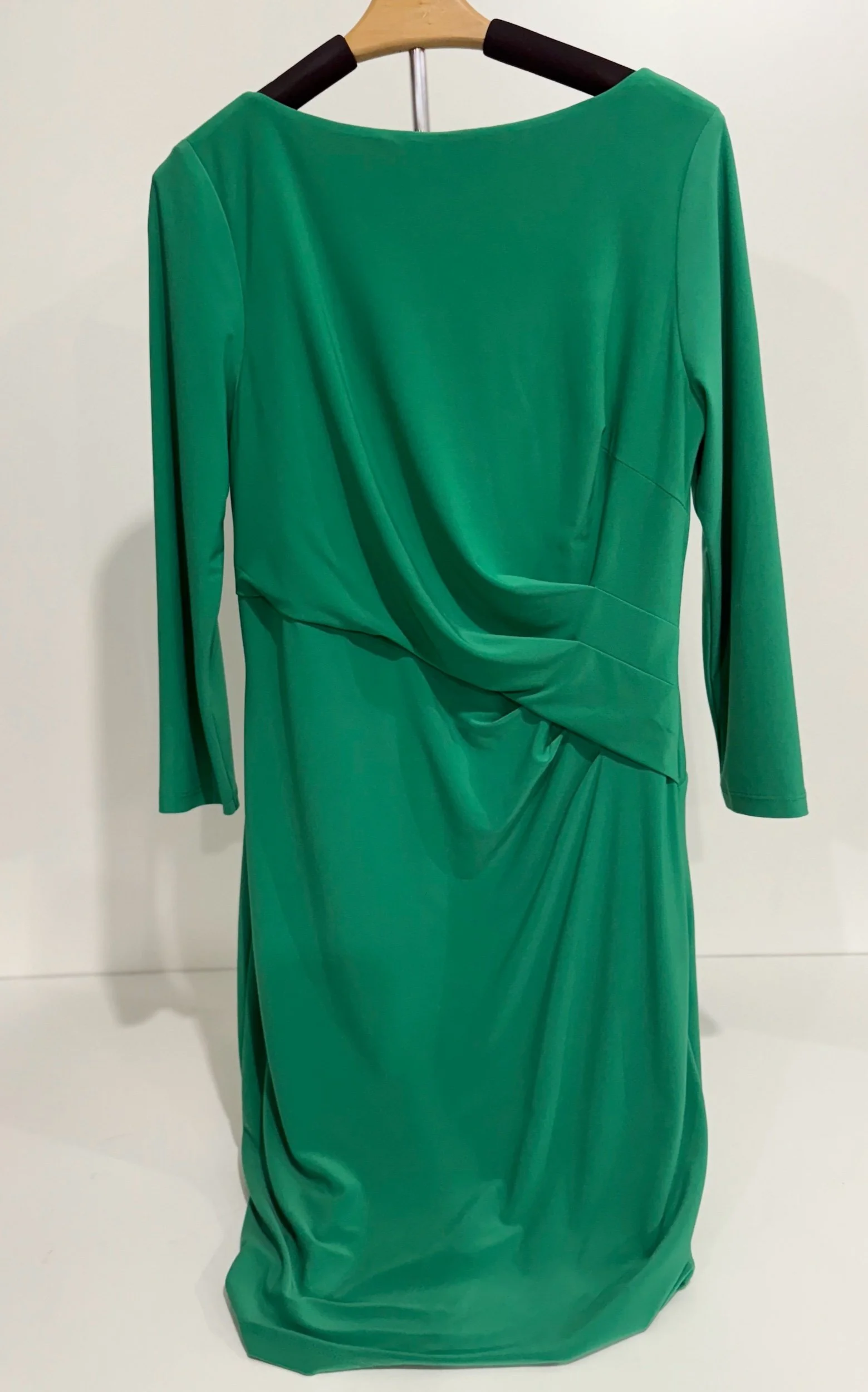 Elegant and timeless, this Lauren Ralph Lauren emerald green dress features a flattering draped waist and a smooth, stretch-knit fabric that shapes beautifully. The 3/4 sleeves and knee-length cut create a polished, classic look that transitions effortlessly from office to evening.